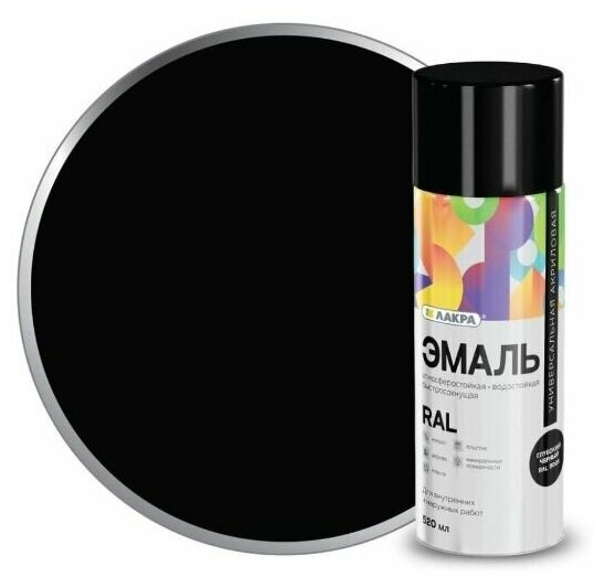 Купите эмаль аэрозольную ЛАКРА акриловую универсальную RAL 9005 Глубокий черный 520 мл! Быстро сохнет, подходит для любых поверхностей, обеспечивает стойкое глянцевое покрытие. Надежность и универсальность по выгодной цене! Доставка по Красноярску и России