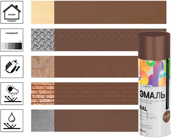 Купите эмаль аэрозольную ЛАКРА акриловую универсальную RAL 8011 Коричневый 520 мл! Быстрое высыхание, универсальность, стойкость к влаге и износу. Идеально для металла, дерева, пластика и др. Защитите и обновите поверхности с гарантией качества! Доставка по Красноярску и России