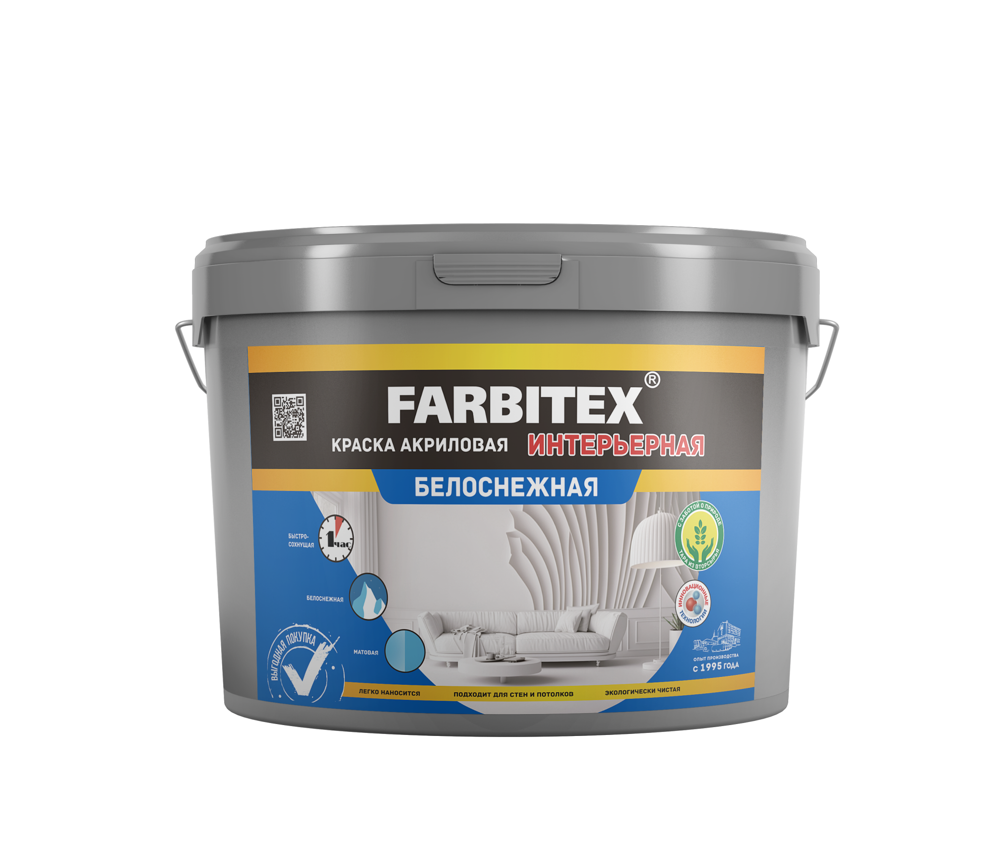 Краска FARBITEX акриловая интерьерная 1,1 кг — идеальный выбор для стен и потолков! Быстро сохнет, почти без запаха, легко колеруется в пастельные тона. Экономичный расход, долговечное покрытие и безопасность. Закажите сейчас с быстрой доставкой по Красноярску и России!