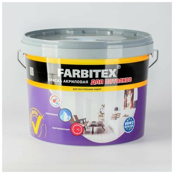 Успейте купить акриловую краску FARBITEX для потолков 3кг! Матовый белоснежный финиш, отличная укрывистость и быстрая сушка — всего 2 часа. Универсальна, легко колеруется, экологична. Количество ограничено! Сделайте выгодную покупку уже сегодня!