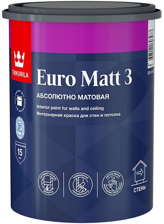 Краска TIKKURILA EURO MATT 3 — это высококачественная акриловая краска для внутренних работ, которая обеспечивает абсолютную матовость и долговечное покрытие. Благодаря своим уникальным свойствам, она идеально подходит для окраски стен и потолков в различных помещениях, создавая уютную и современную атмосферу.