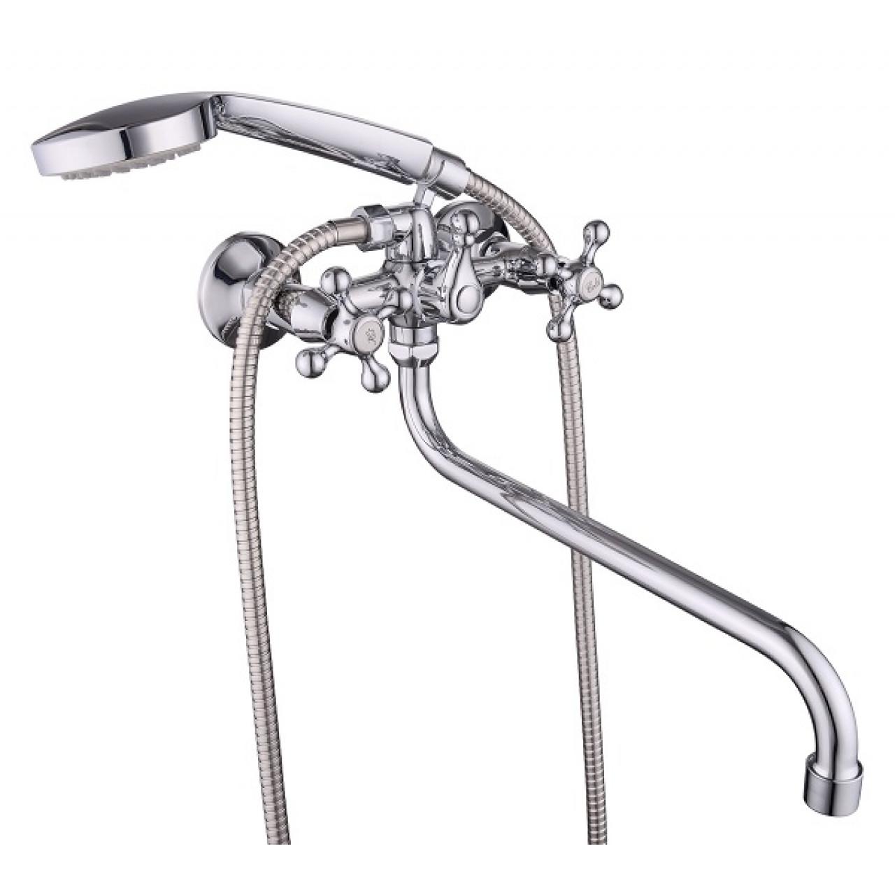 Материал корпуса: латунь. Материал элементов: нержавеющая сталь. Тип управления: двухрукояточный. Длина душевого шланга: 150 см. Высота излива: 35 см. Цвет: хром. В комплекте: набор крепежа, душевой шланг, душевая лейка, держатель душевой лейки. Наличие переключателя душа: есть.