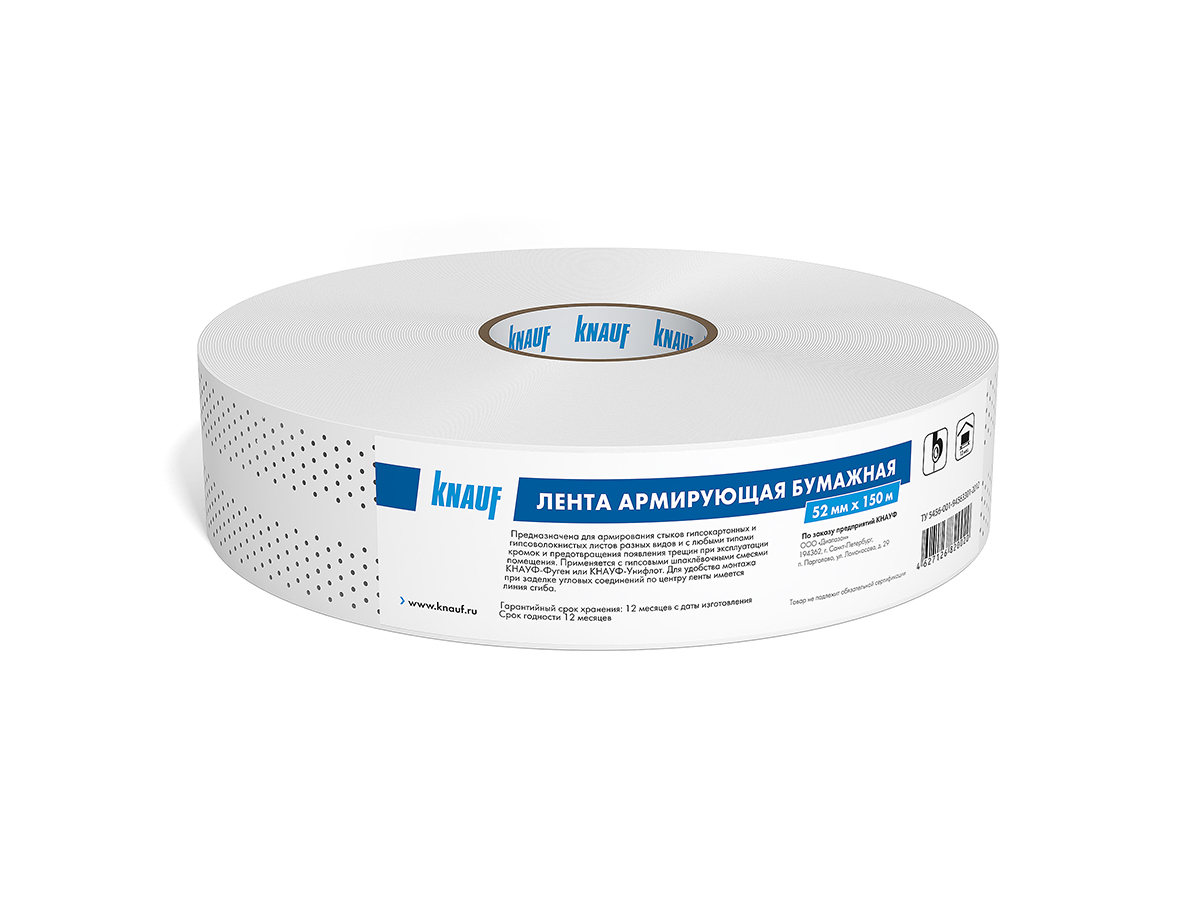 Почему выбирают Ленту КНАУФ? Во-первых, она изготовлена из высококачественной перфорированной бумаги, что обеспечивает отличную адгезию с шпатлевкой и другими отделочными материалами. Во-вторых, лента обладает оптимальной шириной 5,2 см, что позволяет легко и быстро армировать стыки различной ширины. Кроме того, материал отличается высокой прочностью и устойчивостью к механическим нагрузкам.
