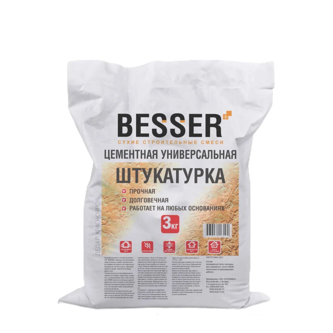 Штукатурка Besser цементная 3 кг – надежное решение для ровных и прочных стен! Высокая клеящая способность, пластичность и атмосферостойкость. Идеальна для фасадов и интерьеров. Сертифицированное качество, быстрая доставка и выгодная цена от Дедал!